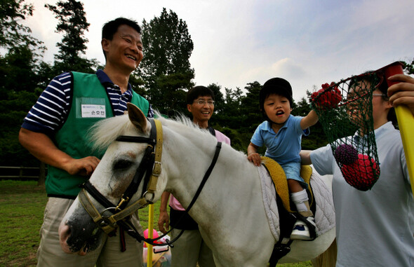 정민우군이 경기 군포시 부곡동 승마장에서 교사와 자원봉사자들의 도움을 받아 말에 탄 채 바구니에 공을 넣고 있다. 삼성전자 승마단은 장애 어린이들에게 전신운동과 같은 운동 효과와 정신적인 안정감을 주는 재활 승마교육을 주마다 두 차례씩 무료로 하고 있다.